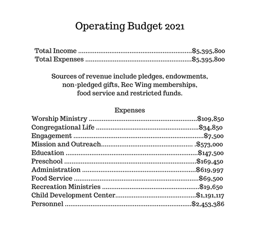 - We are deeply grateful for the strong financial support in 2020 that allowed us to end the year slightly to the good of budgeted giving numbers. Your generosity continues to be extraordinary. In January, we adopted a completely flat budget for 2021even though we are in need of additional pledges to meet that budget. In other words, 2021 will be a faith year for our budgeting, and we are counting on your continued generosity.