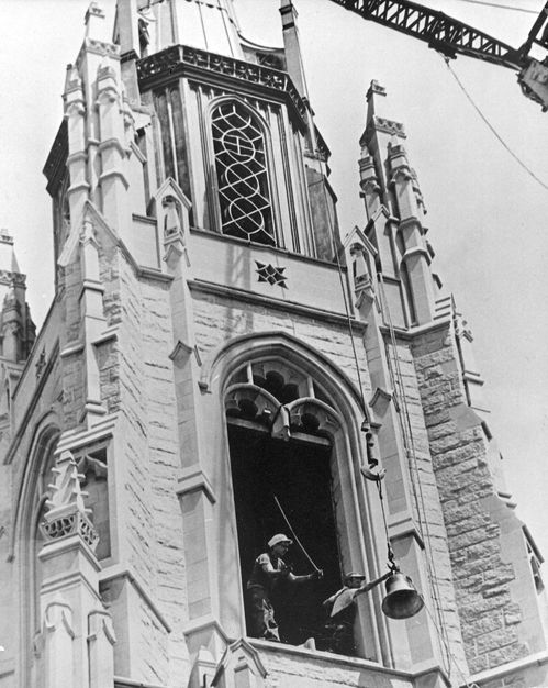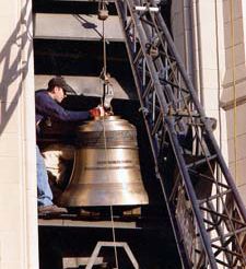Covenant Presbyterian Church's tower houses a 48-bell cast bell carillon and one pealing bell. The bells, which range in size from 22 pounds to 3,300 pounds were cast in Holland by Petit Fritsen.The original "A" bell was the gift of Mrs. Arnold Smith. Forty-one additional bells were given by Mr. and Mrs. James Barnhardt and their sons, James and Sadler, as a memorial to Alan Wilson Hayers, Jr. Later bells were donated by Mrs. Arnold Smith, Dr. George Culbreth and his mother, Mrs. C.B. Culbreth, Mrs. Robert Moore, Mrs. Charles Barnhardt, and the family of Richard Ramey and his mother, Mrs. Robert Ramey. Other bells were given in honor of individuals, whose names are inscribed on the bells along with those of the donors. A memorial plaque bearing the names of all those honored and their donors was placed in the north gallery stairwell as part of Covenant's 50th anniversary celebration. Covenant's memorial carillon was dedicated on Sept. 18, 1966, with a recital by the famed carilloneur Wendall Westcott of Michigan State University. On Jan. 11, 2001, the Low D#" was hoisted to the tower and installed by the Verdin Company of Ohio. The bell and a new Clavier were given in memory of George T. and Adelaide S. Williams by George M. and Sarah E. Williams, and George E. and Sylvia M. Williams.
