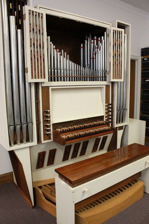 The Sanctuary building Music Studio houses a two-manual, ten rank, mechanical action Flentrop Organ. Built in Zaandam, Holland, this instrument was imported to the U.S. and installed in the Charlotte home of Henry and Daisy Bridges in 1968. Mr. and Mrs. Bridges donated it to Covenant Presbyterian Church in 2010, and David Nelms of Pipe Organs of the Carolinas relocated the instrument to the Music Studio. The instrument serves as a practice instrument as well as a rehearsal instrument for small ensembles and soloists.